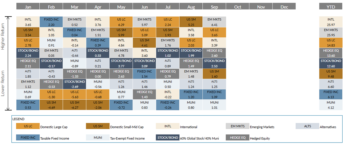 - Bond markets were up throughout the third quarter as markets priced in lower interest rates. In September, the Federal Reserve wound up cutting rates for the first time since 2024, citing a slowdown in labor markets being enough to warrant the reduction. Markets anticipate the Fed Funds rate will fall to 3.0% by the end of 2026. The 10-year yield finished the quarter at 4.15%, down from 4.23% at the end of the second quarter. Municipal bonds rebounded in the quarter with an especially strong September and are up 1.8% for the year.