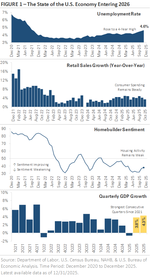 The stacked charts in Figure 1 provide an update on the economy using labor, consumer spending, and housing data released after the shutdown. The top chart shows labor market conditions continued to soften in Q4, with unemployment rising to a four-year high as hiring slowed. The second chart, which graphs the year-over-year growth rate of retail sales, highlights the consumer’s resilience. Consumer spending has cooled since 2022, but it remains steady despite affordability challenges and persistent inflation. The third chart graphs the homebuilder sentiment index, where readings above 50 signal positive sentiment. The index ticked higher in recent months, but it remains below 50, an indication that housing activity continues to run below the pre-pandemic trend. The bottom chart shows GDP growth rose to +4.3% in Q3, up from Q2’s +3.8%. Those are the strongest consecutive quarters of growth since 2021, before the Fed’s aggressive rate hiking cycle.