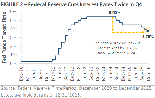 The Federal Reserve continued its rate-cutting cycle in Q4, but policymakers delivered a more nuanced message than simply lowering rates and offering forward guidance. Figure 2 shows the Fed has cut interest rates by a total of -1.75% since starting its rate-cutting cycle in September 2024. Two of those cuts came in Q4, with -0.25% reductions at the October and December meetings. However, the messaging behind the two cuts changed. Officials have grown more cautious and divided, with several voting members favoring either no cut or a larger cut, and they’ve emphasized that future rate cuts will depend on incoming data.
