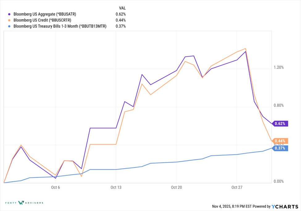 The ongoing government shutdown delayed several key economic releases, limiting visibility into the broader economy. With labor and select inflation reports postponed, the Fed Funds Rate 25 basis point rate cut to a target range of 3.75%–4.00% remains the most significant policy development.