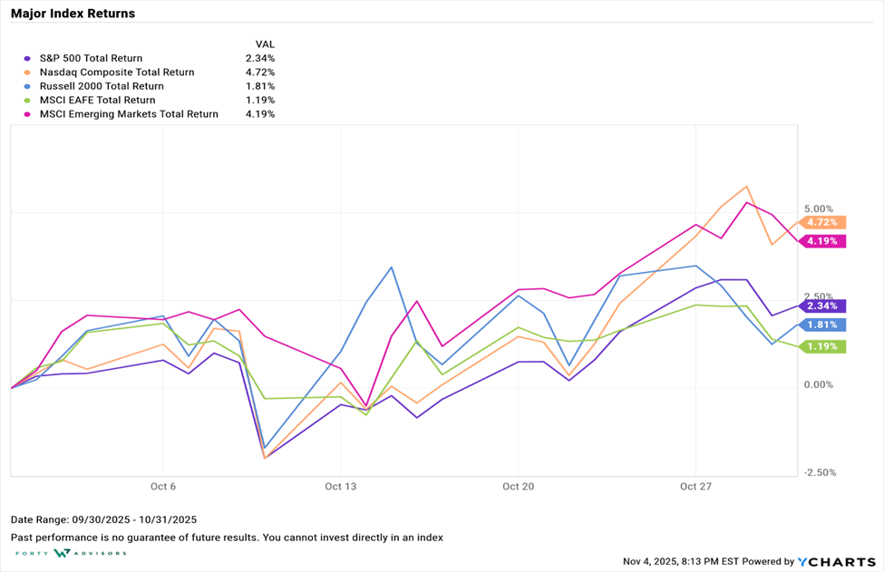 Markets moved higher across the board for the second straight month, as the S&P 500 posted a gain of 2.3%. This advance was led by the Nasdaq and emerging markets, which increased by 4.7% and 4.2% respectively. October’s broad-based gains reflect continued investor confidence, as the Fed cut interest rates by 25 basis points for the second consecutive month.